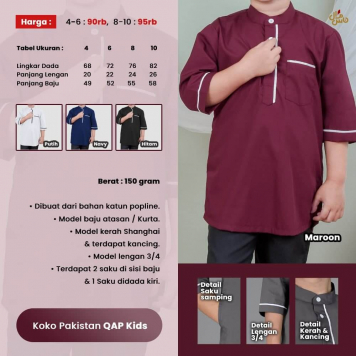 Koko Pakistan Anak dengan bahan katun popline. Buat Ayah-ayah yang pengen tampil kompak sama anaknya, sekarang ada QAP Kids.